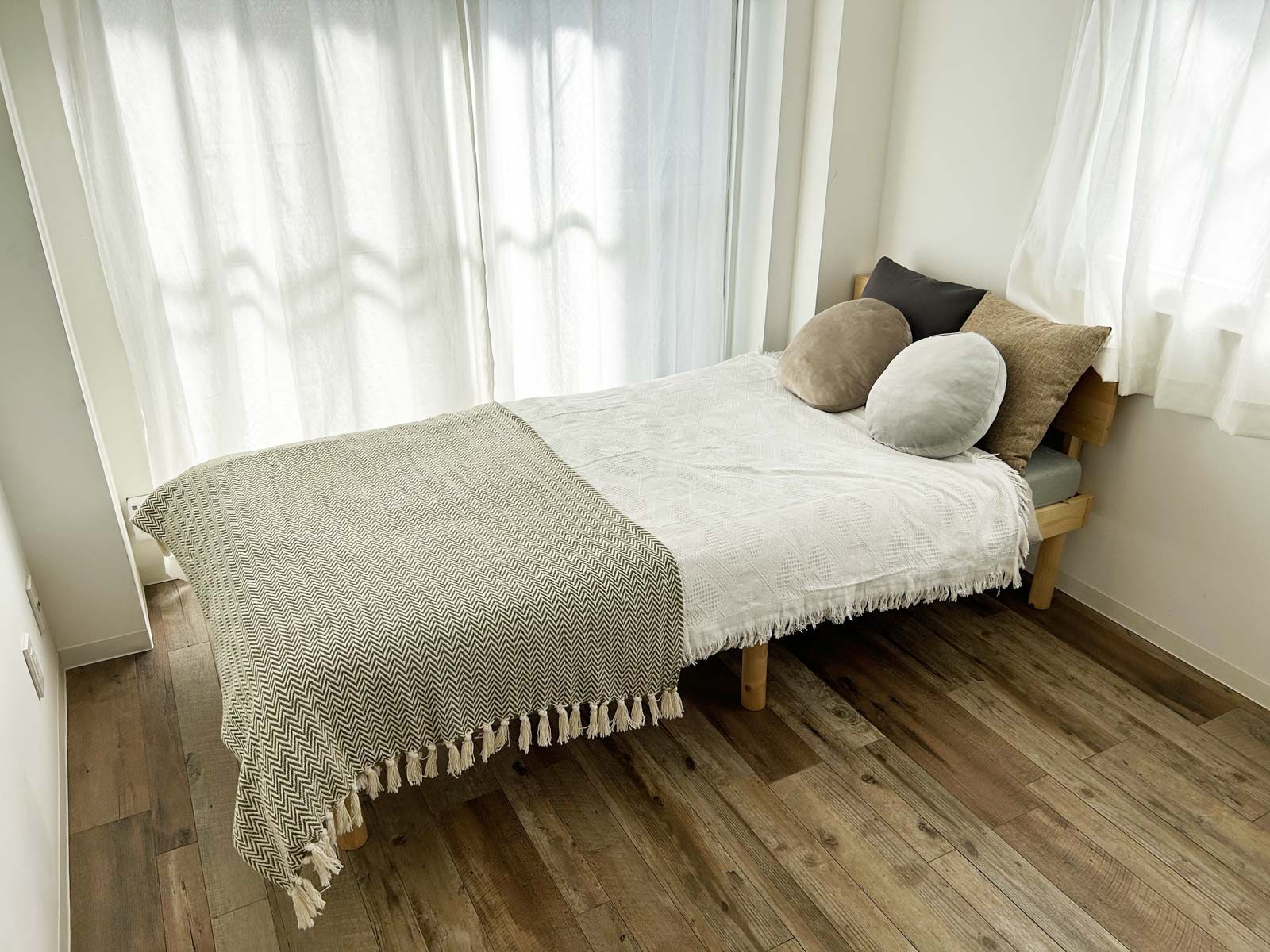シングルベッド この備品がある部屋:ロイネ ワンルームの部屋にピッタリのサイズです。 女性の部屋をイメージしたクッションも常備。 スタジオロイネは日当たりも良好なので、寝起きのシーンとの相性も良いです。